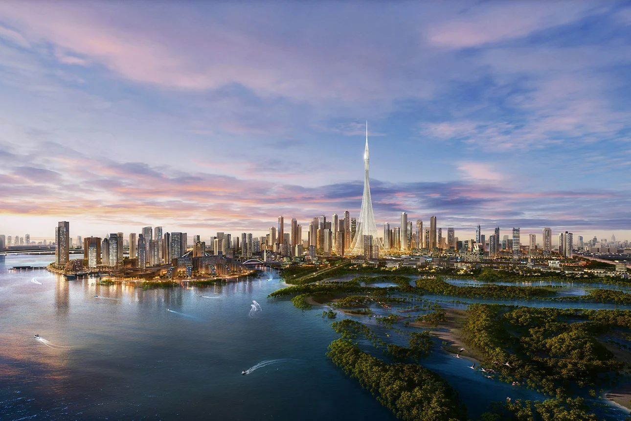 Mit deutlich über 1000 Meter Höhe sollte ursprünglich der 828 Meter hohe Burj Khalifa übertroffen werden. Der spektakuläre Entwurf für den Creek Tower wurde während einer Baupause aber überarbeitet. Doch das Gebäude, an dem die Bauarbeiten nun wieder laufen, hat nach wie vor das Potenzial, der höchste Turm der Welt zu werden. Rund um den Creek Tower ist mit dem Dubai Creek Harbour bereits ein komplett neuer Stadtbezirk im Entstehen.